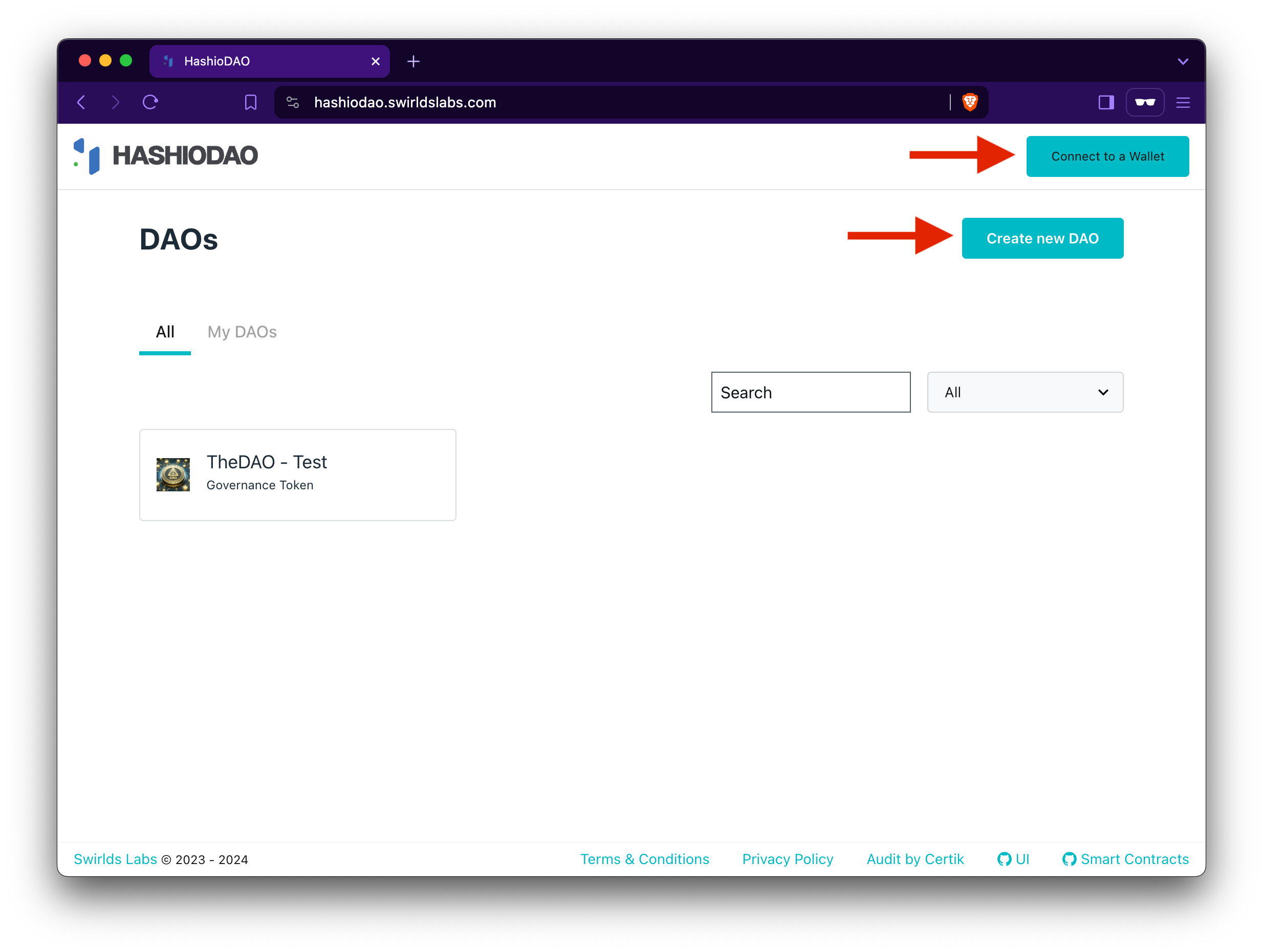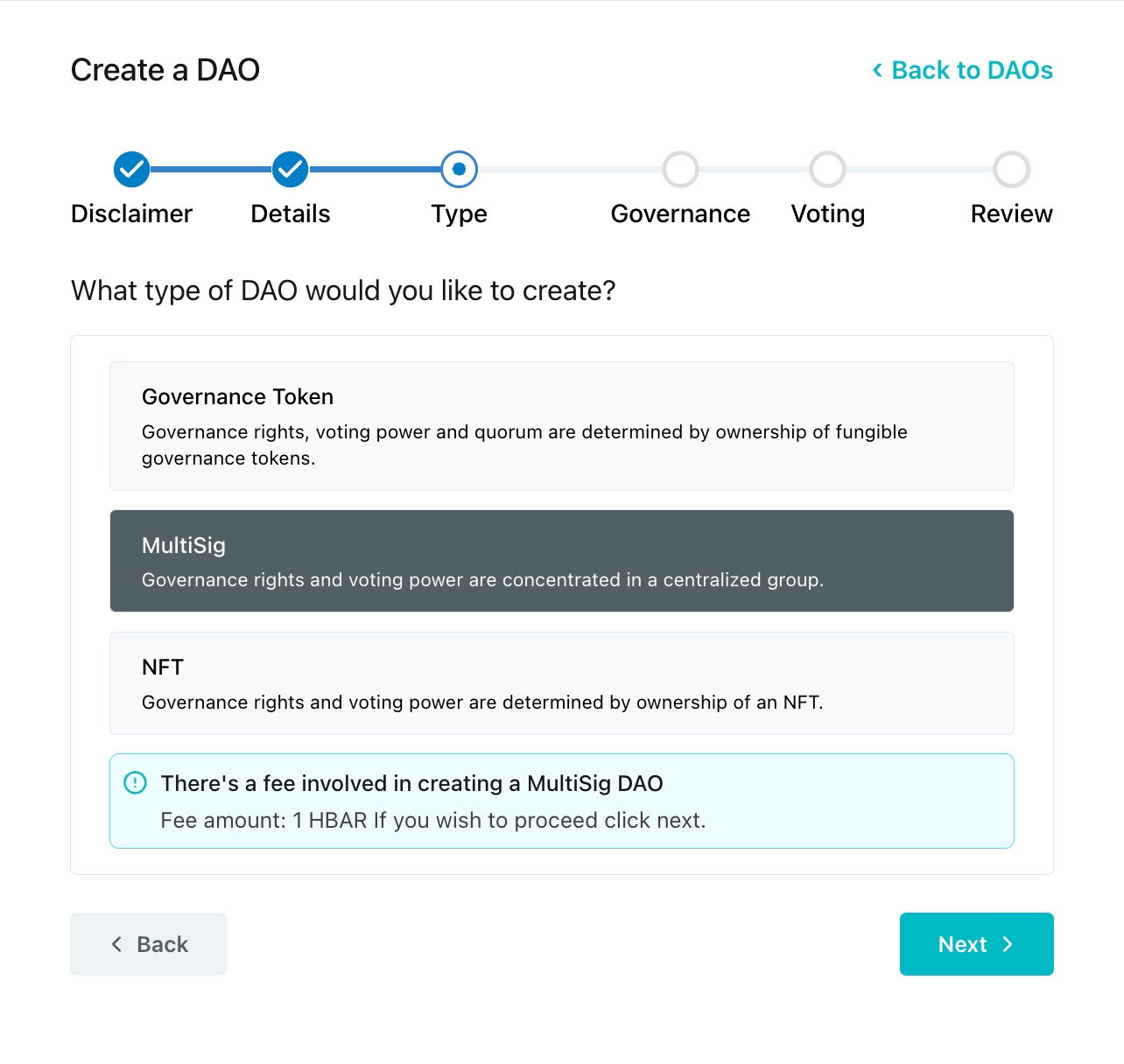 After creating and funding a Hedera account, navigate to the HashioDAO web application dashboard and connect your wallet. Once your wallet is connected, click Create a new DAO and this will guide you through a series of setup steps where you will define the details of your DAO including name and governance type.