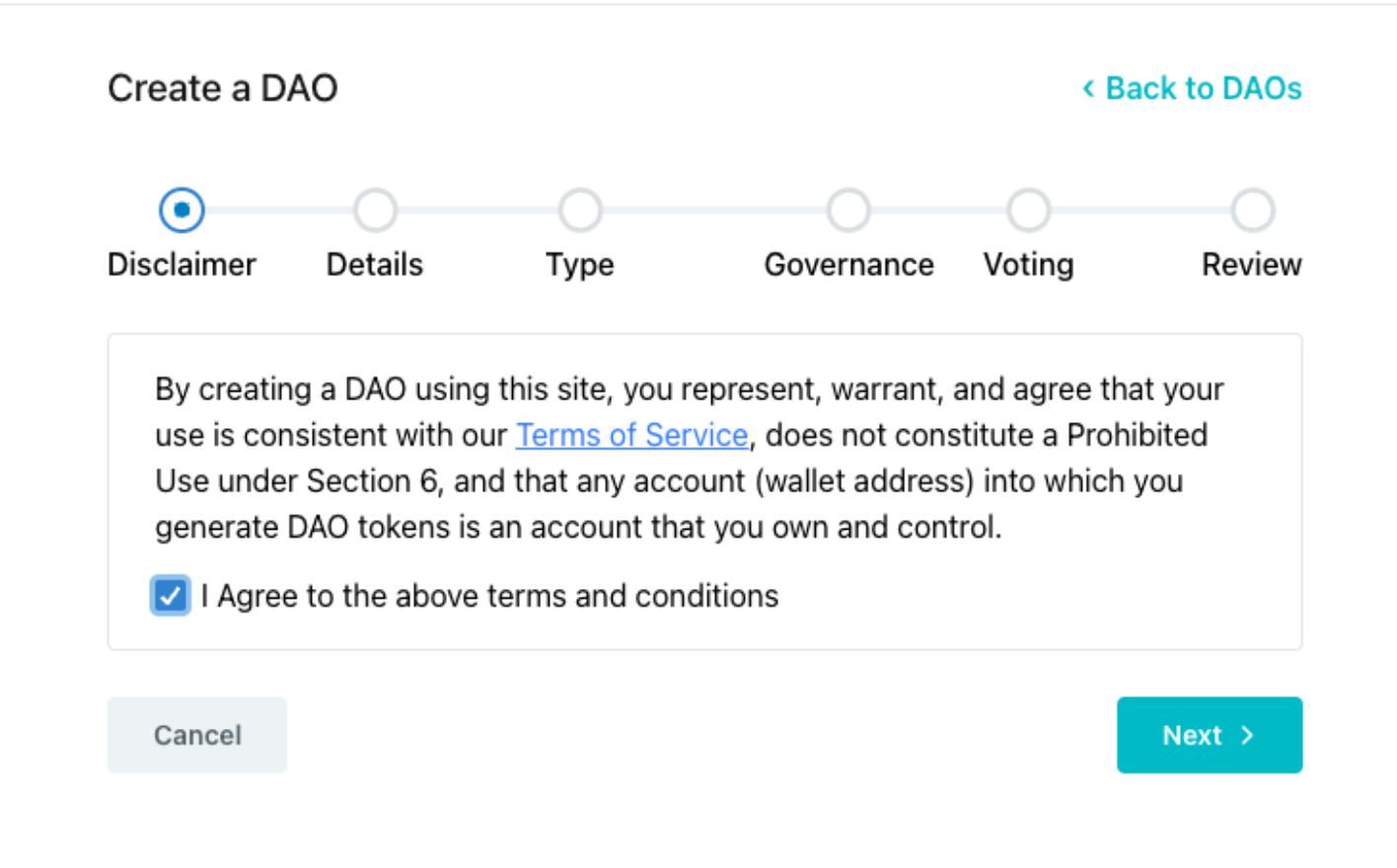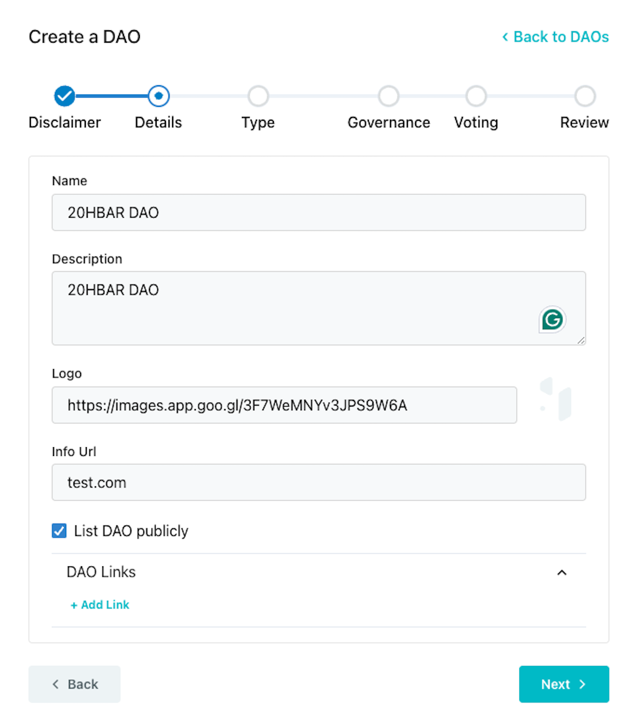 Define the details of your DAO by filling out each field. These details are important because it creates your DAO’s public profile and how the community will be identified.
