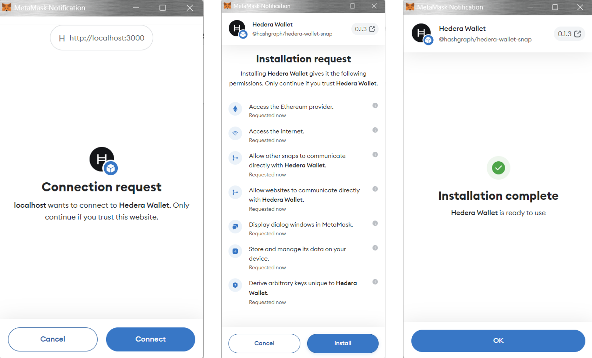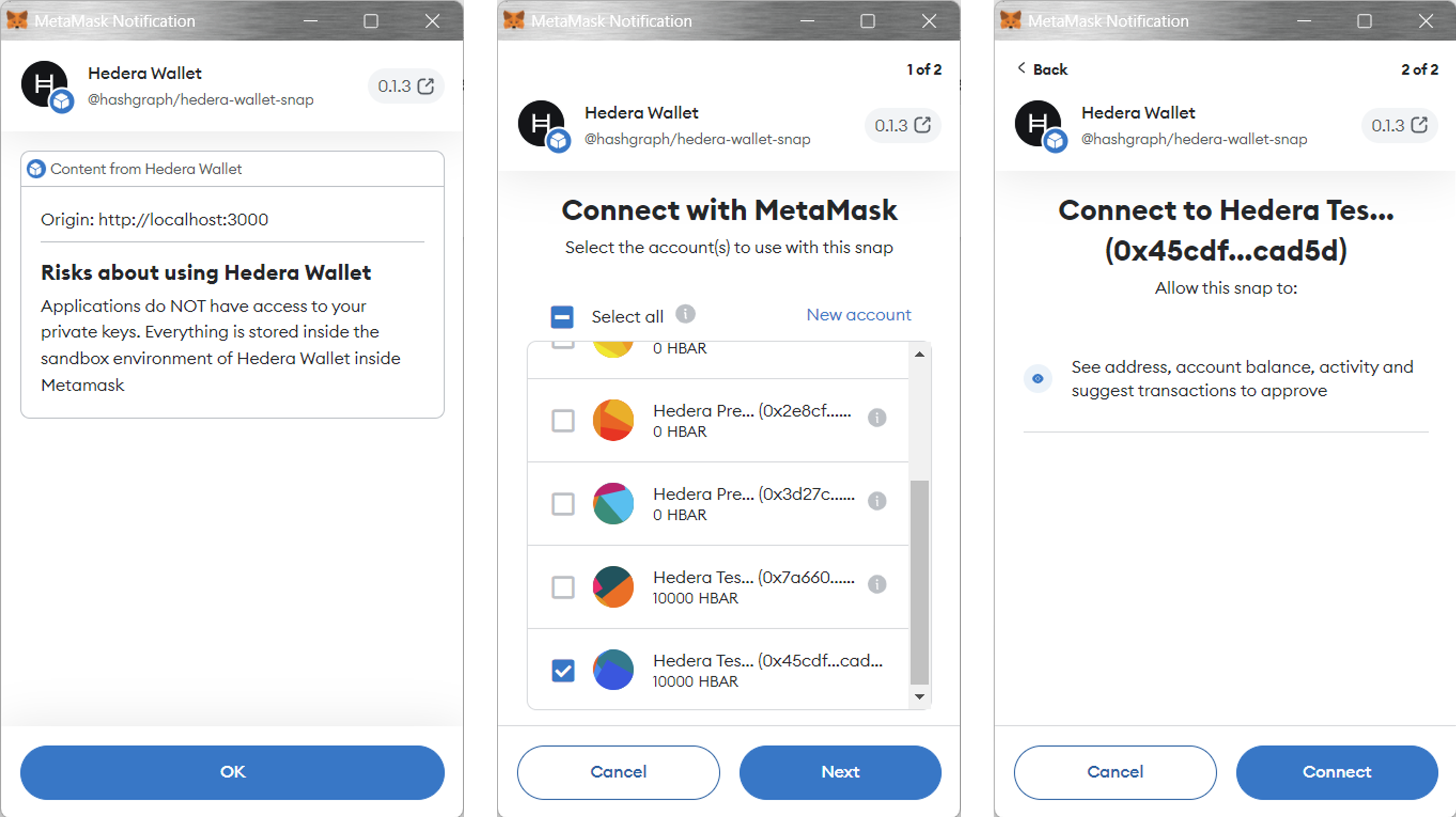 Note: When invoking a Snap method for the first time, MetaMask checks for confirmation before connecting the Hedera Wallet Snap to the account.