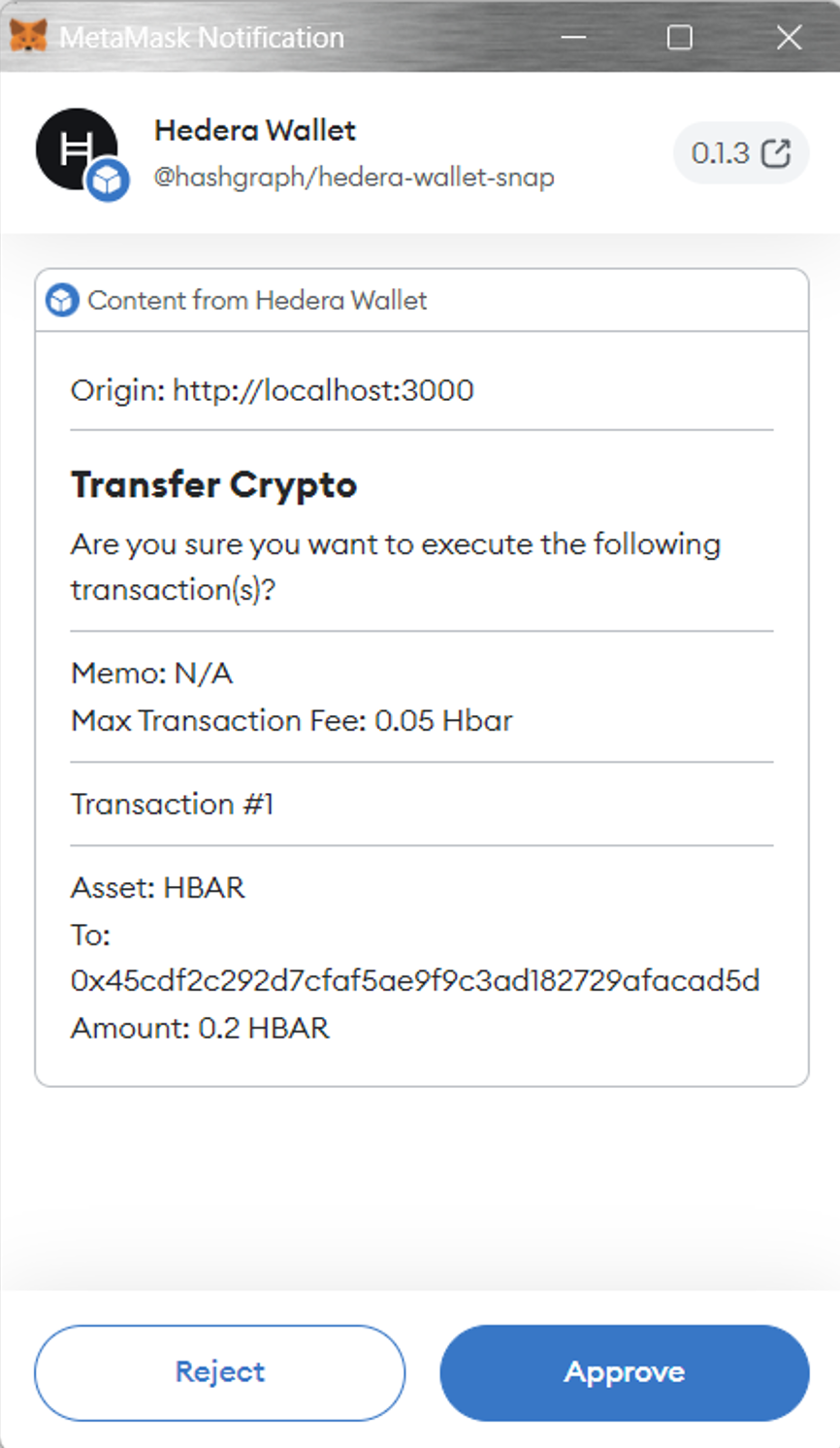 const transferText = await snapTransferHbarFcn(network, walletData, snapId, [receiverAddress, hbarAmount]);