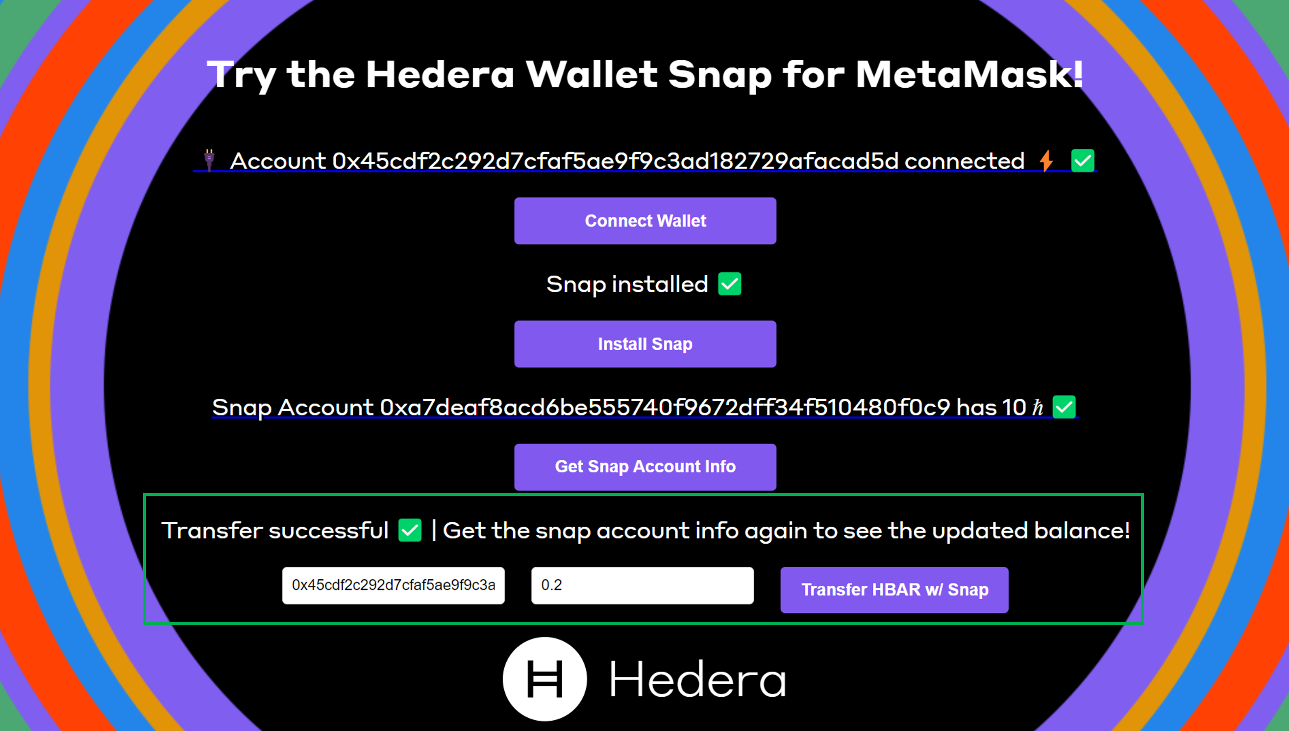 🎉 Congratulations! You have learned about the new Hedera Wallet Snap by MetaMask and how to integrate it into a dApp. Feel free to reach out in Discord if you have any questions!