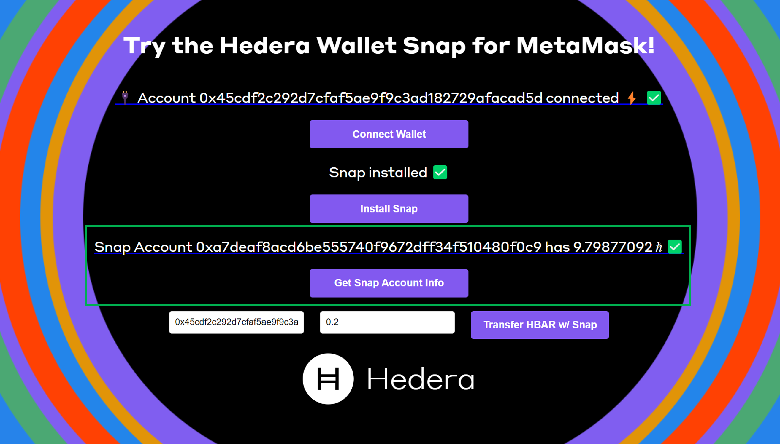 • The fourth button (and respective input boxes) uses the Hedera Wallet Snap to transfer HBAR.