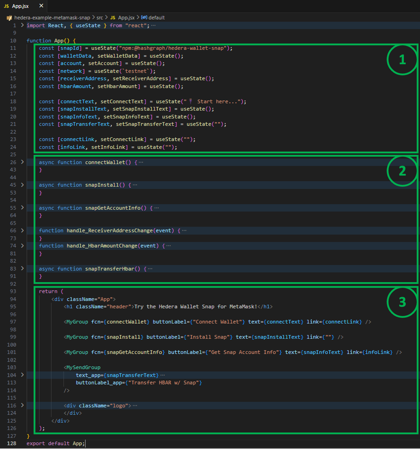 The useState() hook helps store information about the state of the application. In this case, we store information like the snapId, wallet data, the account that is connected, the network, and the receiver address and HBAR amount, along with text and links presented in the UI. Remember that the first output of useState() is the variable of interest (e.g., walletData), and the second output is a function to set a new value for that variable (e.g., setWalletData).