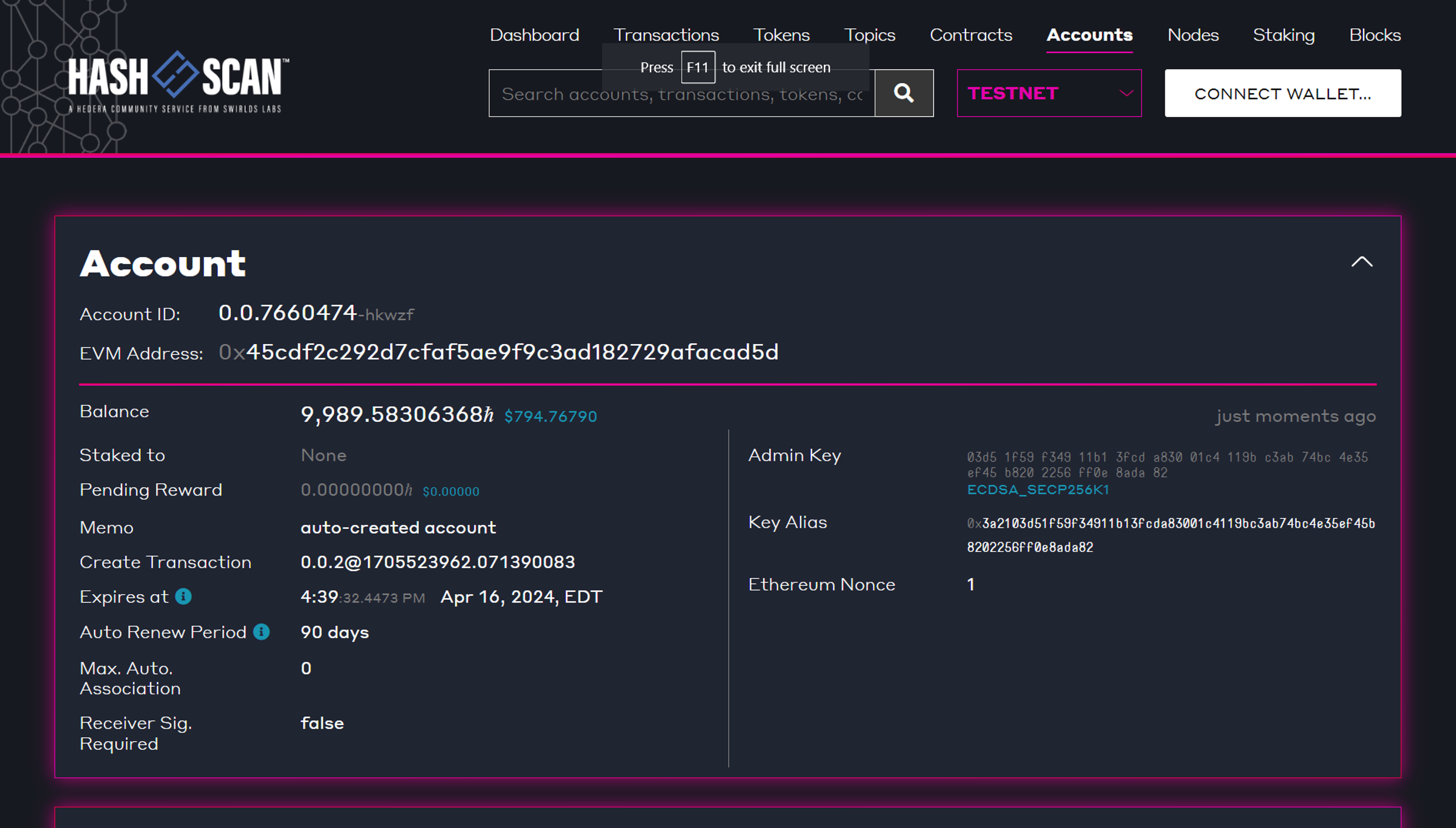 Once the network switches and the account is paired, you should see something like the following in the dApp UI and in HashScan (if you click on the hyperlinked text showing the account address).