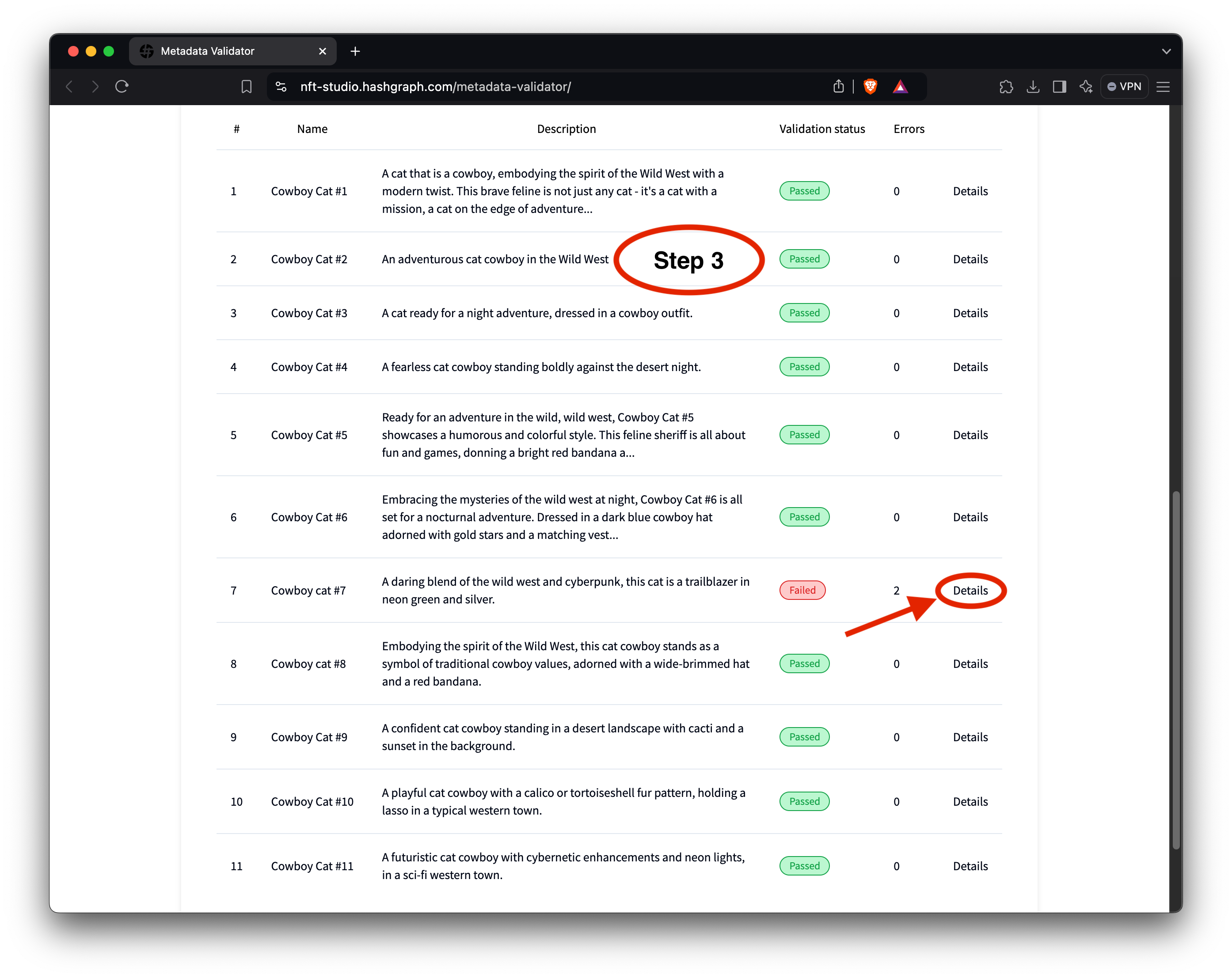 After processing, the tool will return a list of the validation results for each NFT in the file (see the above image in Step 2). It will indicate whether the metadata passes or fails the HIP-412 standards tests.